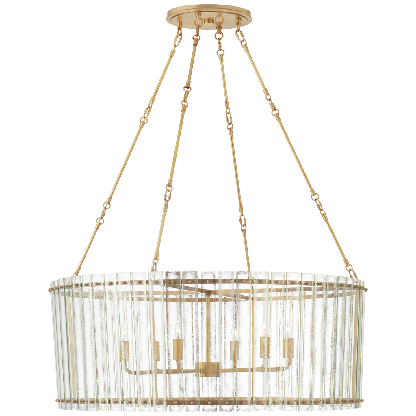 The Cadence Large Chandelier by Carrier and Company. Available in Hand-Rubbed Antique Brass with Antique Mirror Shade.